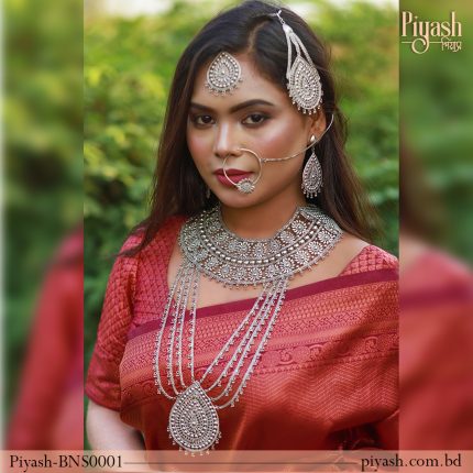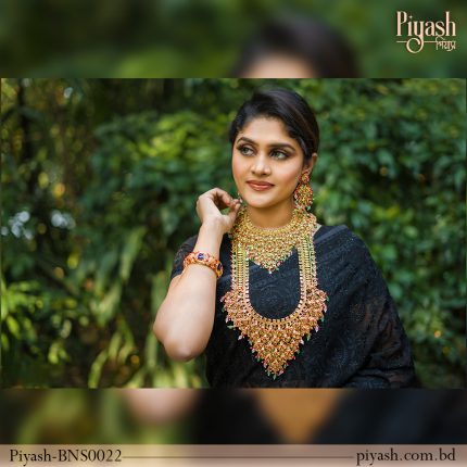 The Golden Radiance Bridal Set embodies timeless elegance with its intricate craftsmanship and luminous gold finish. Designed for brides seeking a traditional yet stunning appearance, this set complements richly embroidered sarees and lehengas. Its detailed floral motifs and multi-layered chains add a royal touch, making it perfect for weddings and festive celebrations.