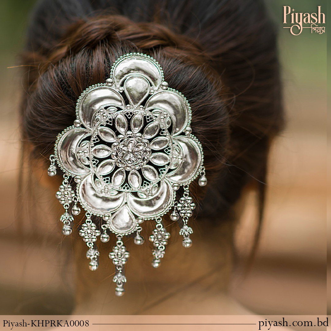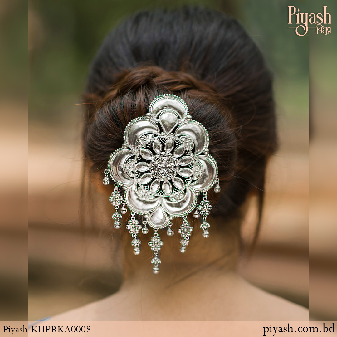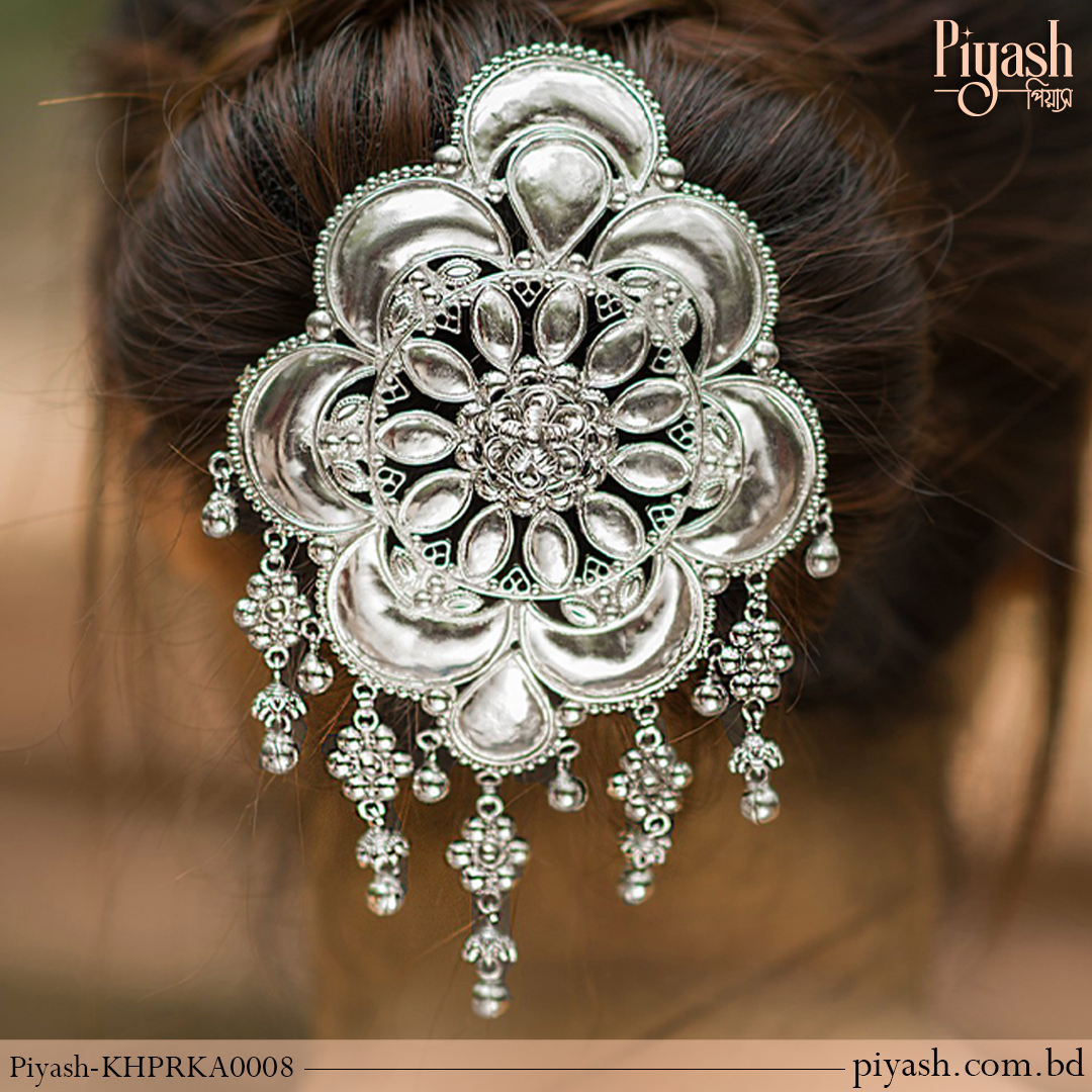 The Floral Silver Elegance Khopar Kata is an exquisite accessory designed to bring elegance and sophistication to any hairstyle. Crafted from high-quality brass with a silver-tone finish, it features a delicate flower design adorned with fine beadwork and hanging chains that sway gracefully, creating a timeless appeal. Ideal for weddings, bridal events, or cultural ceremonies, this khopar kata adds a luxurious touch to traditional hairstyles. The combination of floral detailing and elegant chain accents makes it a perfect choice for those seeking a refined, vintage-inspired look.