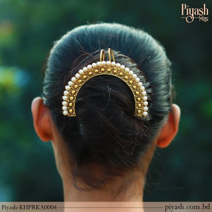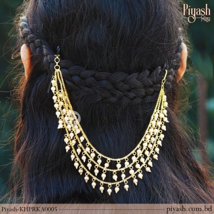 The “Rupkotha Regal Khopa Kata” is a stunning bridal and festive hair accessory that radiates royal charm. Its layered pearl chains gracefully frame the hair, while the cascading circular motifs create an elegant flow down the braid or open hair. The blend of ruby red stones, shimmering silver, and pearls makes it a perfect statement piece for weddings, cultural celebrations, or dance performances.