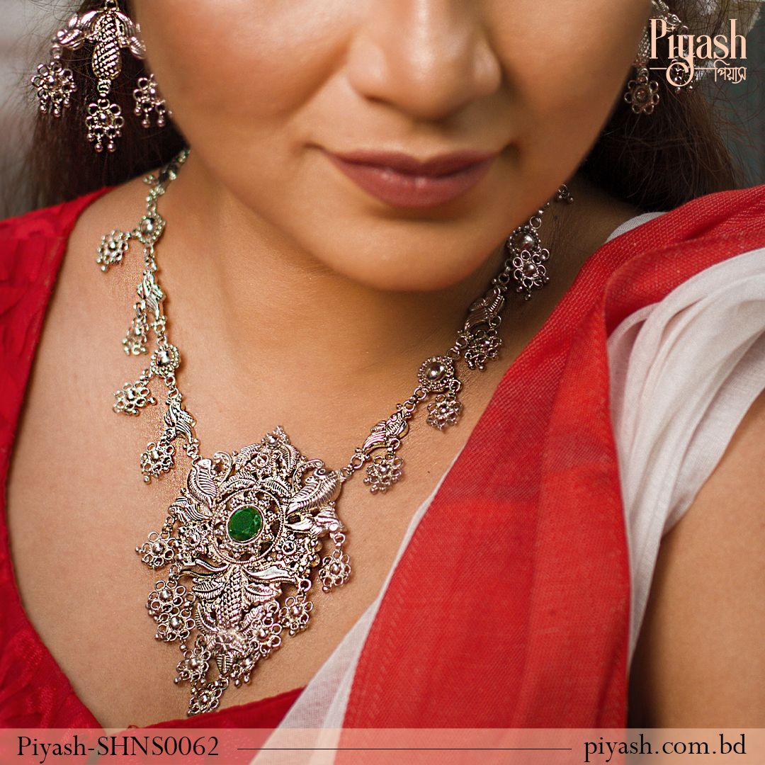 Design: Intricate filigree leaf motifs cascading into a bold floral pendant with a central emerald-green stone