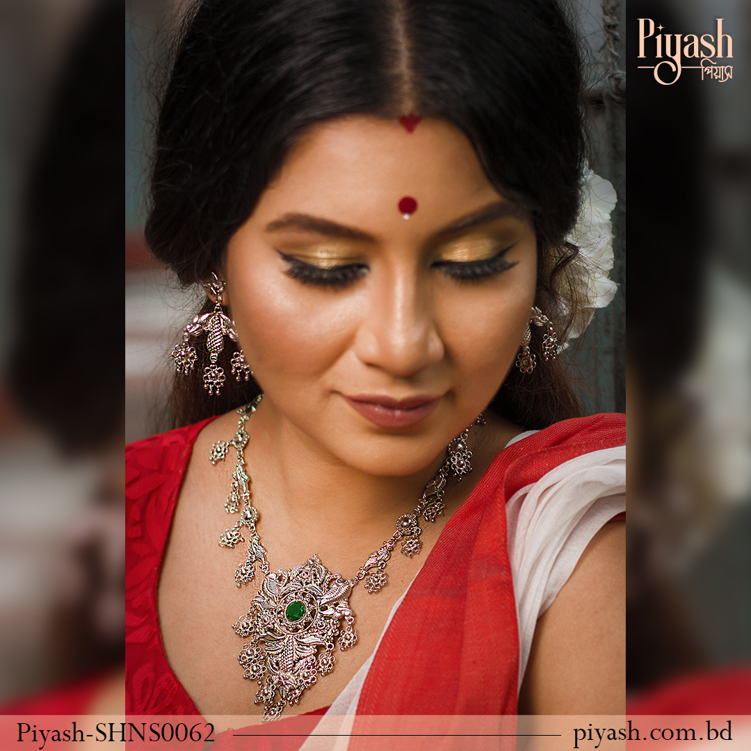 Inspired by lush foliage, the Viridi Cascade set captures the freshness of new leaves and dewy blooms. The emerald-green stone at its heart adds a vibrant focal point, while the delicate dangling charms bring movement and charm. Style it with a deep-red or black saree for a striking contrast, or pair it with crisp whites and greens for a cohesive, nature-inspired look.